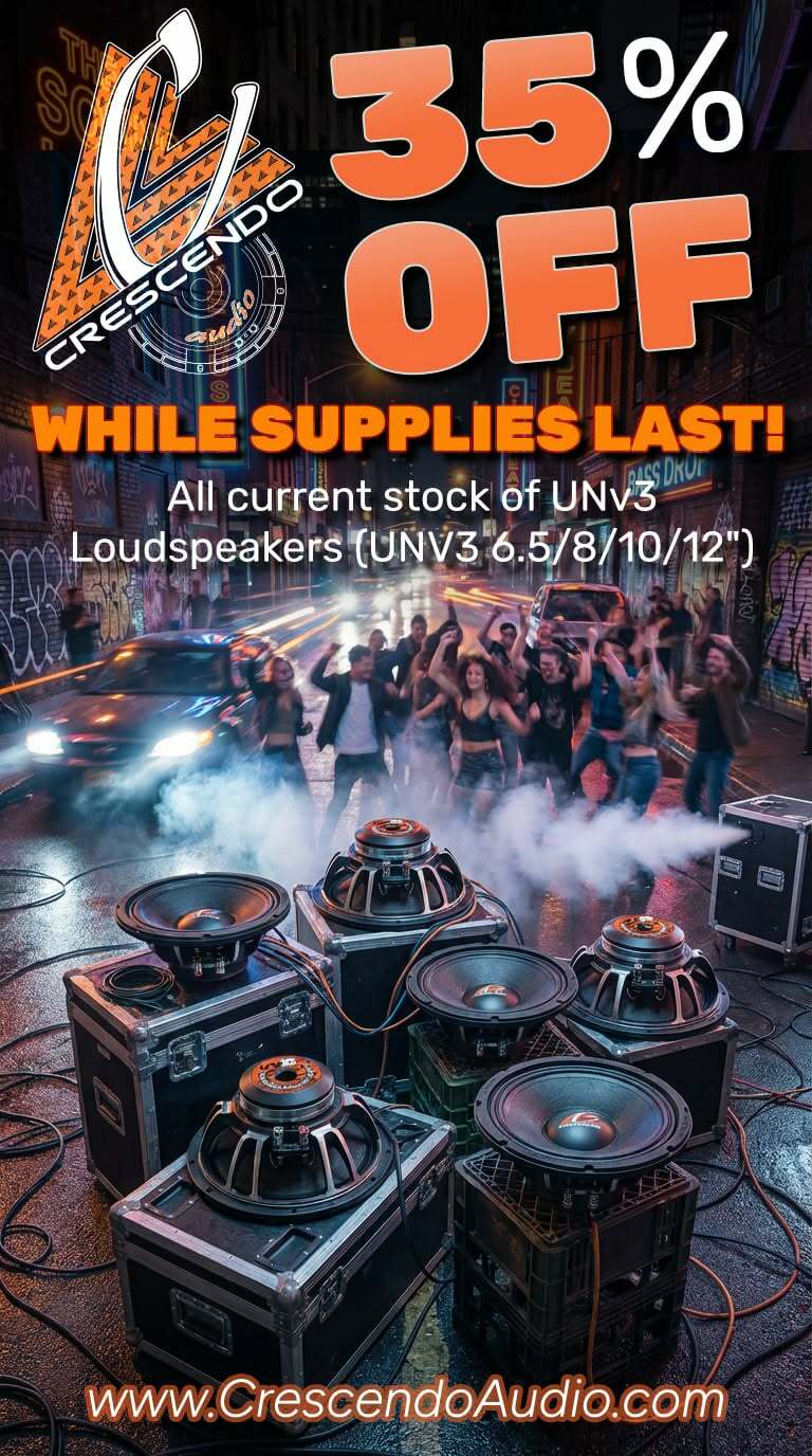On Sale! Wishlist Quick view Choose Options Crescendo Audio UN-8v3 8" Loudspeaker MSRP: $219.99 MAP PRICE: $109.99 SALE PRICE: $71.49